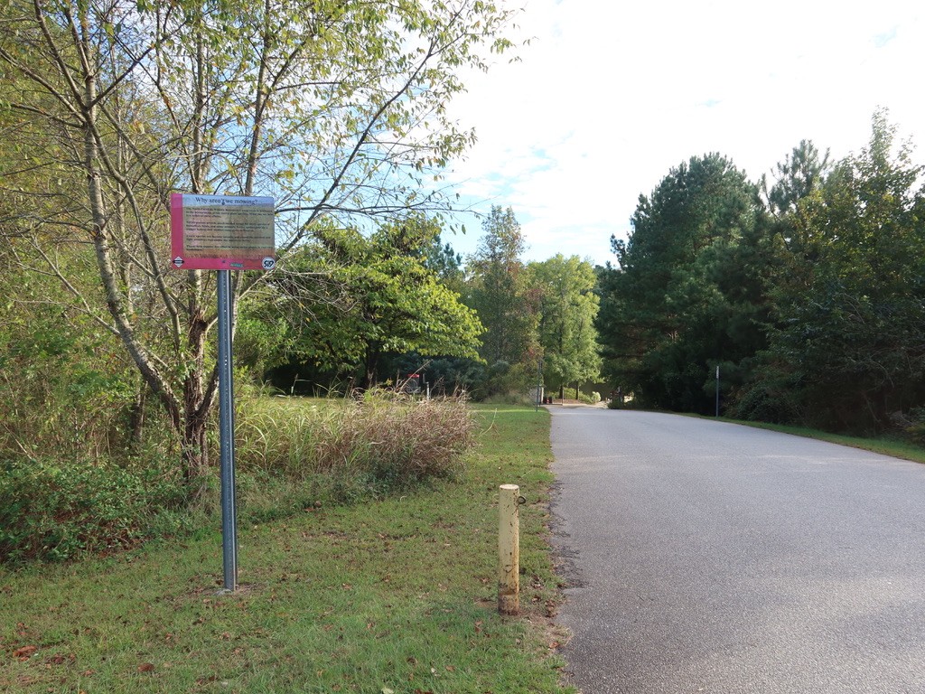 Each of the nine holes are marked with an individual sign indicating the par, distance, trajectory, and a historical fact. A white arrow at each hole turns natural obstacles and overgrown foliage into a course obstacle. At the end of each basket, a smaller circular sign directs players to the next hole.