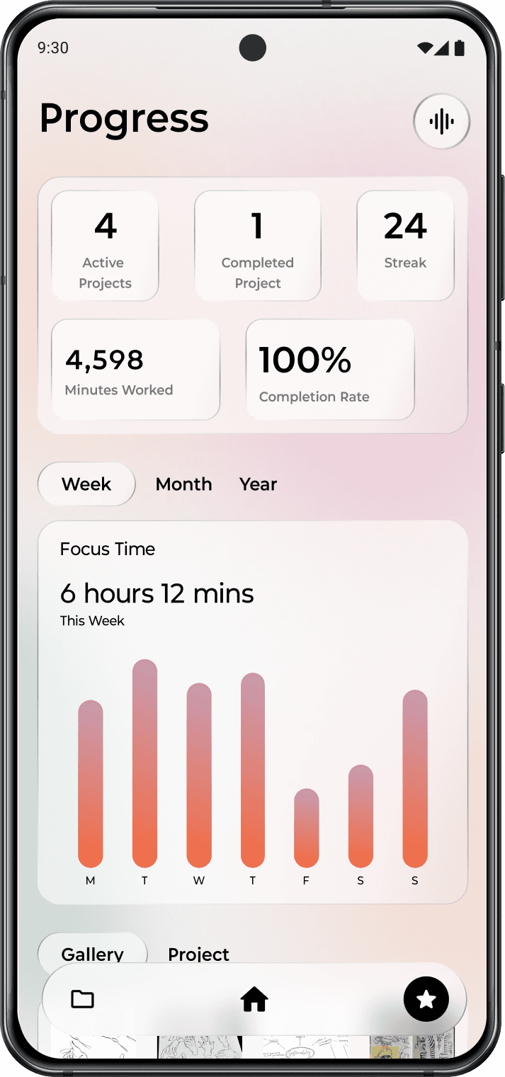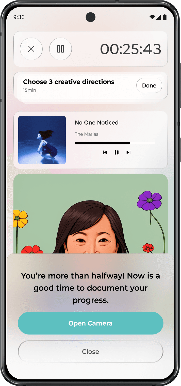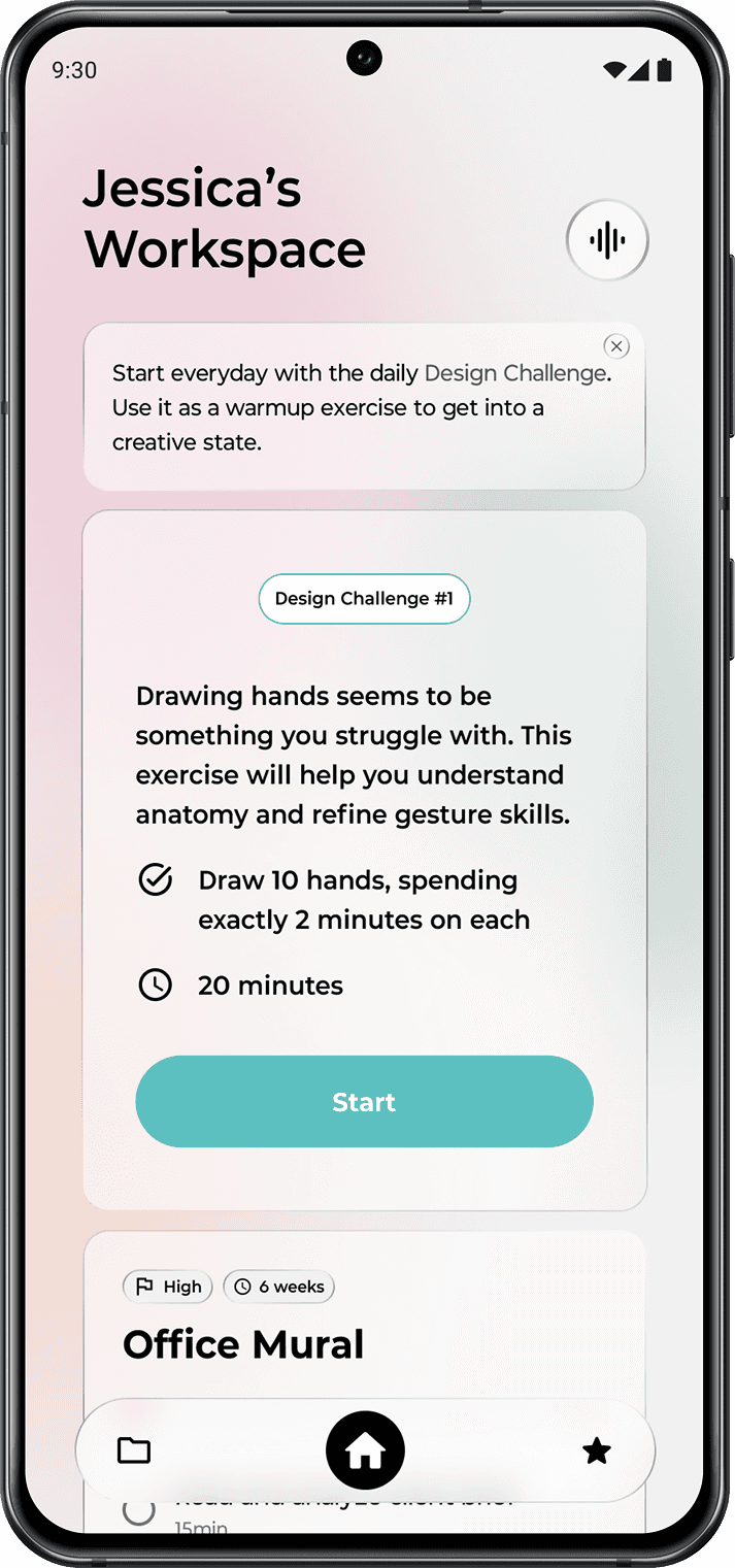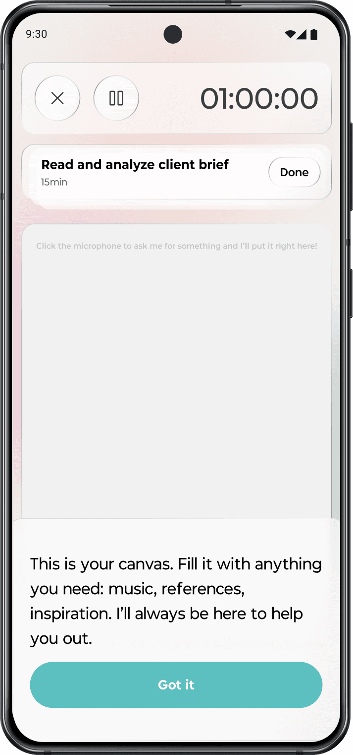 A personalized AI partner that guides creatives through their process and keeps track of their progress.