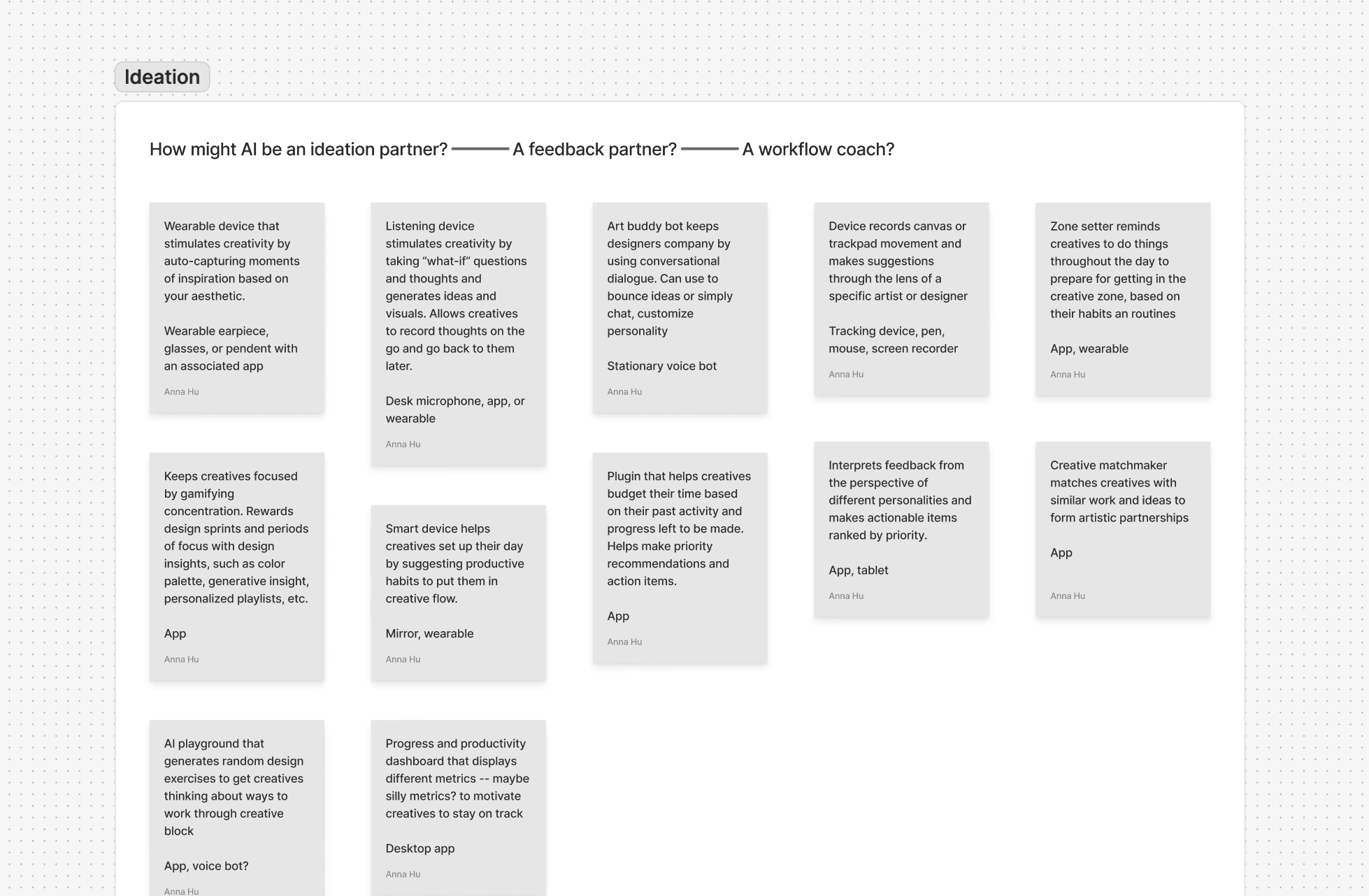 Using How Might We questions, I rapidly brainstormed ways that AI could help creatives ideate, improve their workflows, and make creativity fun.